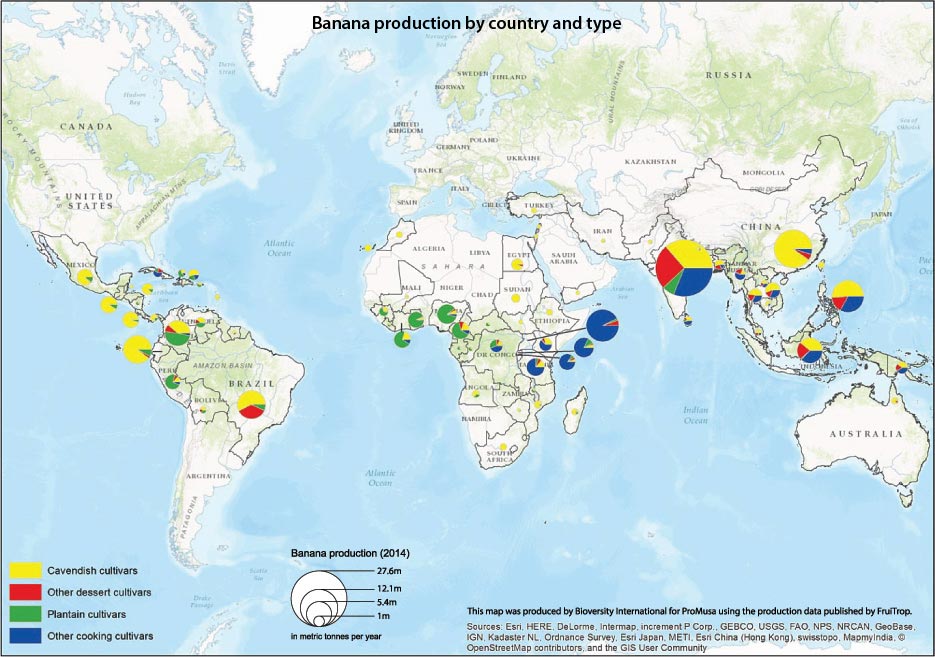 This map shows areas where vulnerability may be greatest because of the low genetic diversity of the high levels of Cavendish banana cultivation. Source: https://www.promusa.org/display3123